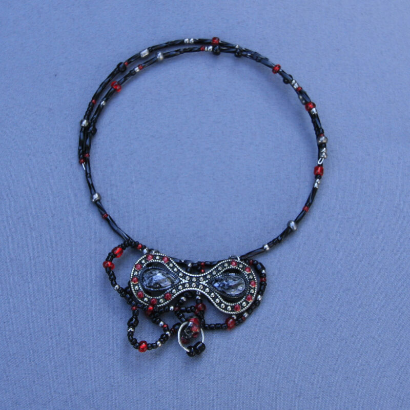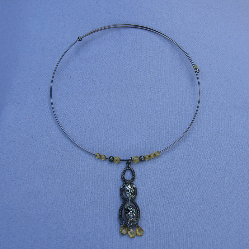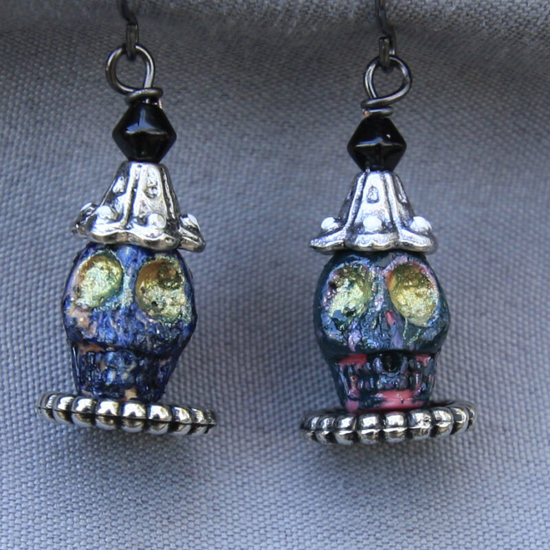 These earrings features a royal pair of dark teal and pink or beige colored Skell heads with ruffled collars, their eyes are a yellow/green flecked color and they each wear a conical hat topped with a black bead atop their heads. Be the life, or death, of the party by wearing this pair.